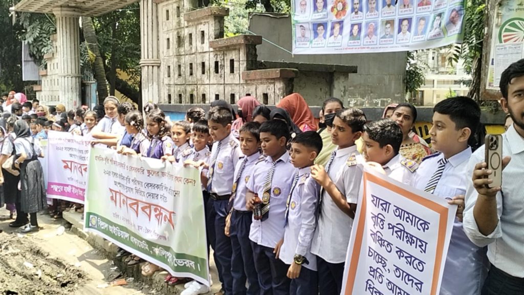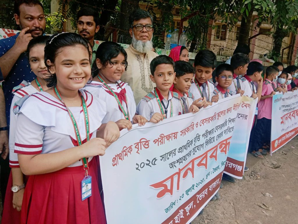 ভৈরবে প্রাথমিক বৃত্তি পরীক্ষার অধিকার ফিরে পাওয়ার দাবিতে বেসরকারি শিক্ষা প্রতিষ্ঠানের শিক্ষার্থী ও অভিভাবকদের মানববন্ধন কর্মসূচি পালন করা হয়। এতে উপজেলার প্রায় শতাধিক বেসরকারি স্কুলের কোমলমতি শিক্ষার্থী, শিক্ষক ও অভিভাবকেরা অংশগ্রহণ করেন।