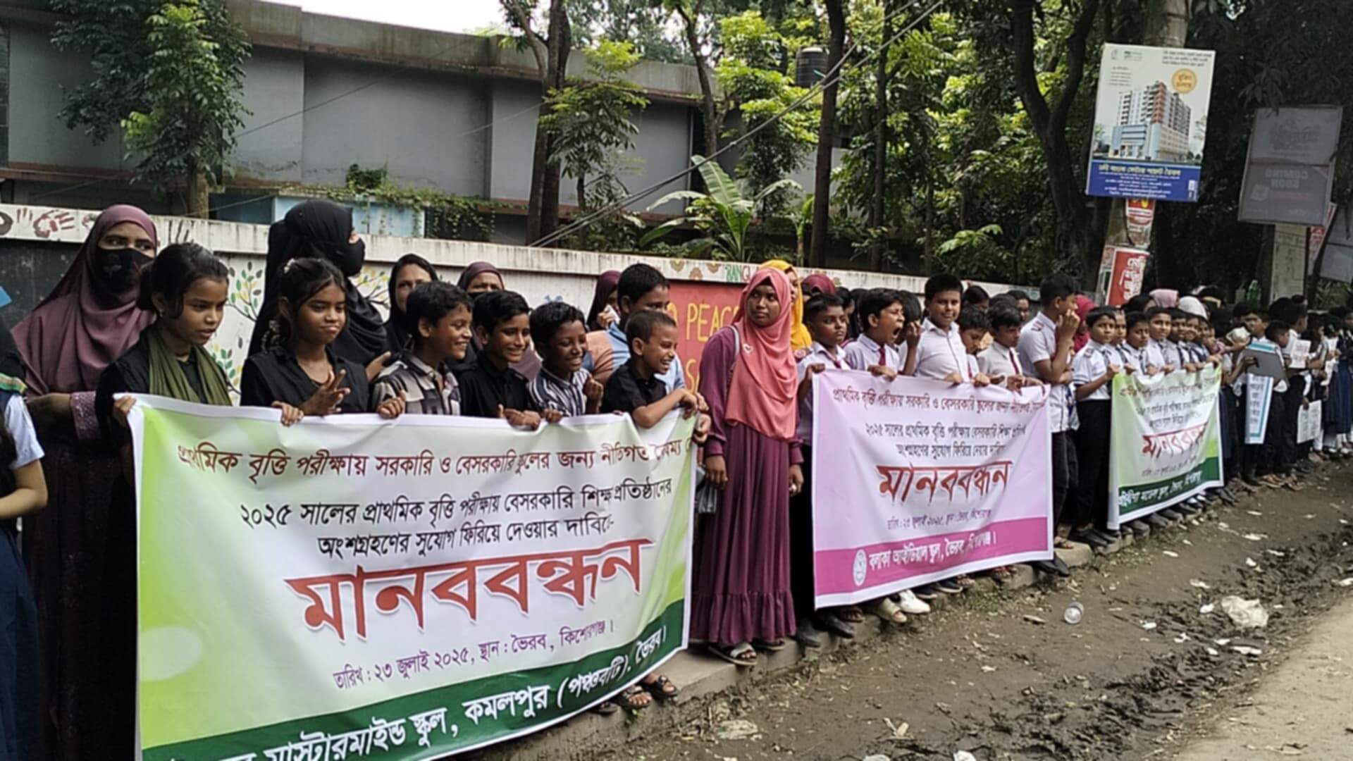 ভৈরবে প্রাথমিক বৃত্তি পরীক্ষার অধিকার ফিরে পাওয়ার দাবিতে বেসরকারি শিক্ষা প্রতিষ্ঠানের শিক্ষার্থী ও অভিভাবকদের মানববন্ধন কর্মসূচি পালন করা হয়। এতে উপজেলার প্রায় শতাধিক বেসরকারি স্কুলের কোমলমতি শিক্ষার্থী, শিক্ষক ও অভিভাবকেরা অংশগ্রহণ করেন।