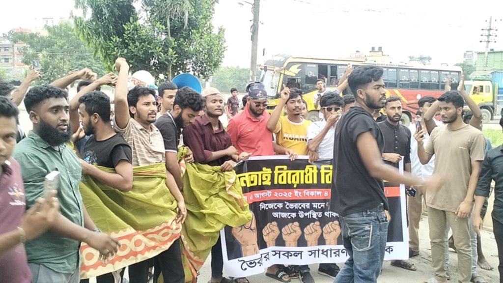 এসময় ছাত্রনেতা আজহারুল ইসলাম রিদম বলেন, আমরা ভৈরবে নিরাপদে নেই। আজকে সকালেও ভৈরবে ছিনতাই হয়েছে। প্রতিদিন কোথাও না কোথাও ছিনতাই হচ্ছে। ভৈরব থানা পুলিশ ছিনতাই প্রতিরোধে ব্যর্থ হয়েছে। আজকে আমরা থানা পুলিশের জন্য শাড়ি ও চুড়ি নিয়ে আসেও তাদের দেয়নি। দুই দিনের আল্টিমেটাম দিয়েছি। যদি ভৈরবকে ছিনতাই মুক্ত না করতে পারে তাহলে আমরা থানার প্রতিটি পুলিশকে শাড়ি চুড়ি উপহার দিবো।